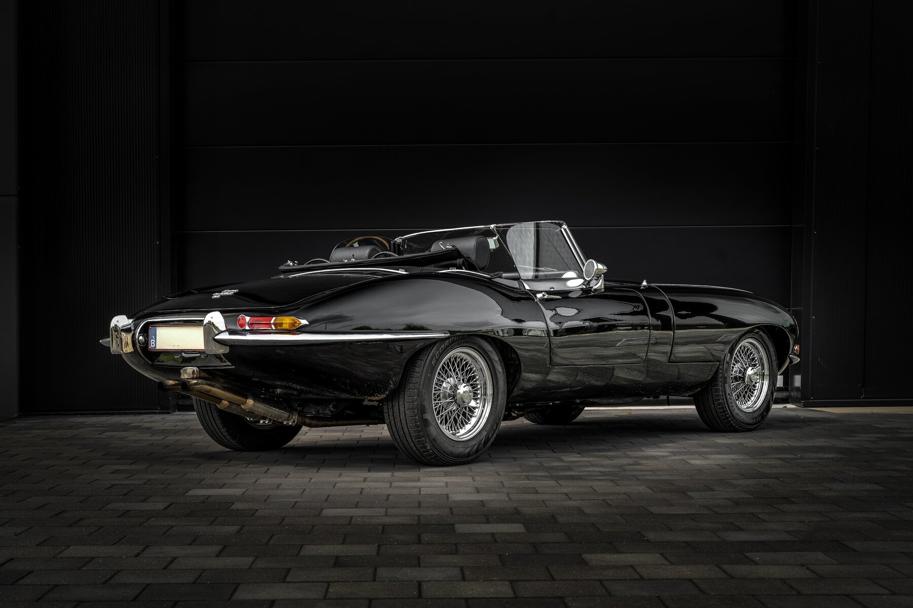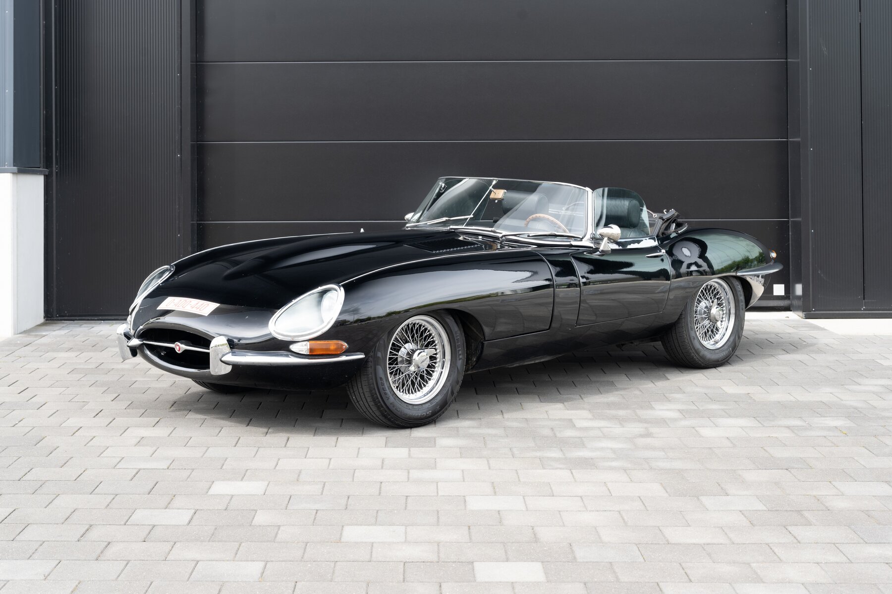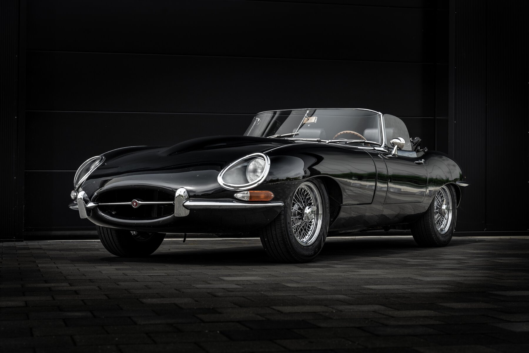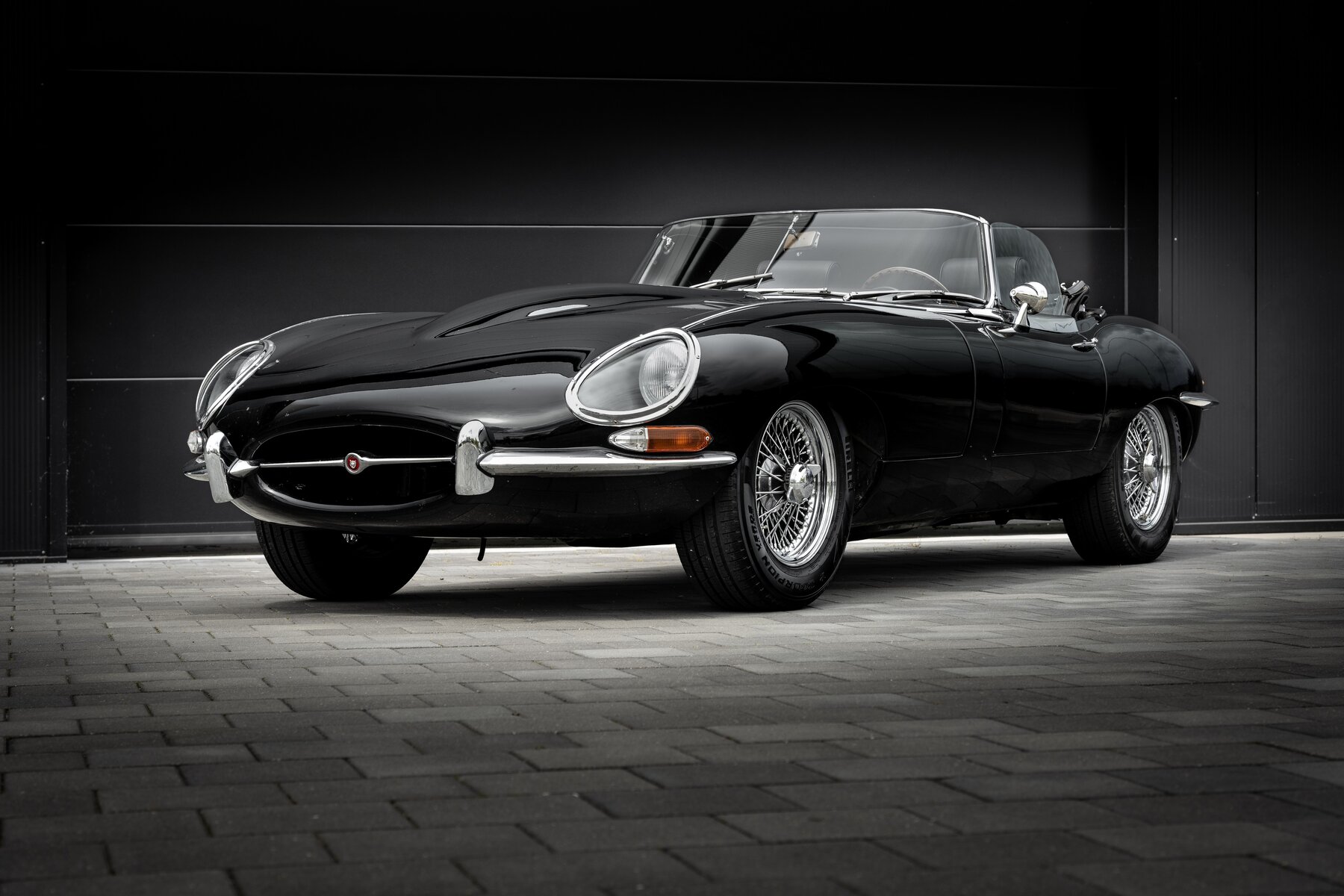 De uitvoering is bijzonder stijlvol en tijdloos: zwart exterieur, een zwart mohair cabriodak, zwart lederen interieur en prachtige chromen spaakwielen. Een uiterst elegante en krachtige kleurencombinatie die perfect past bij de sensuele lijnen van de E-Type. Met open dak komt het lange motorkapprofiel, de lage zitpositie en de klassieke Jaguar-sfeer nog sterker tot hun recht.