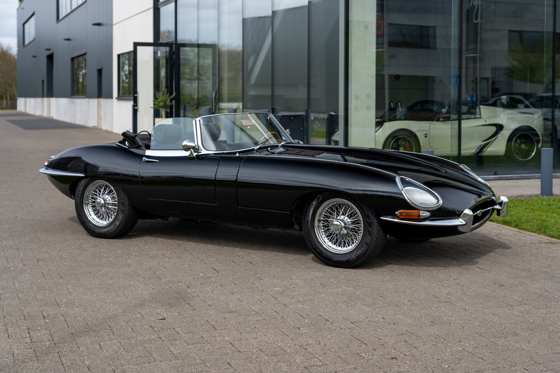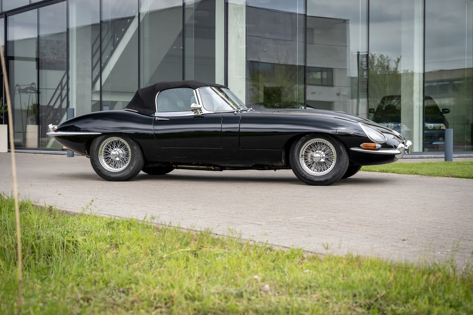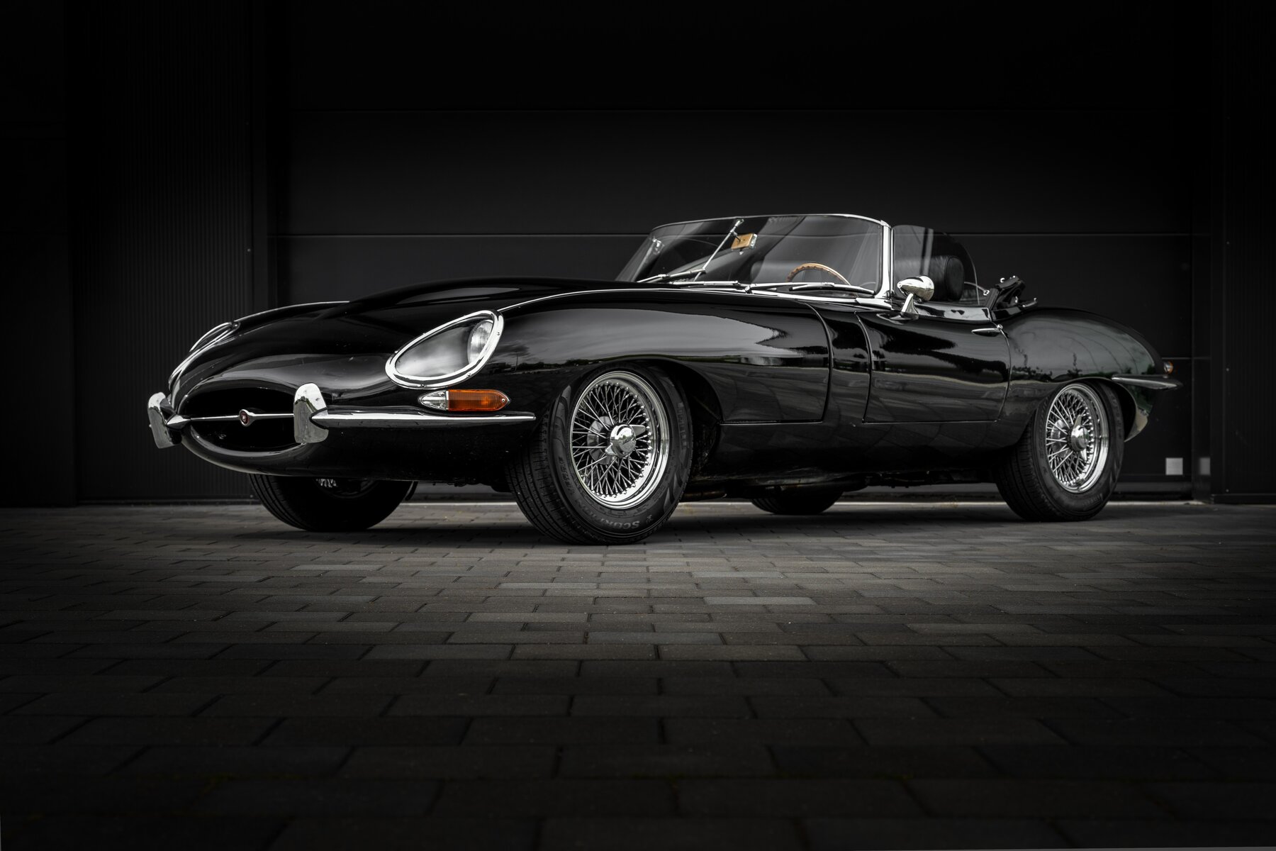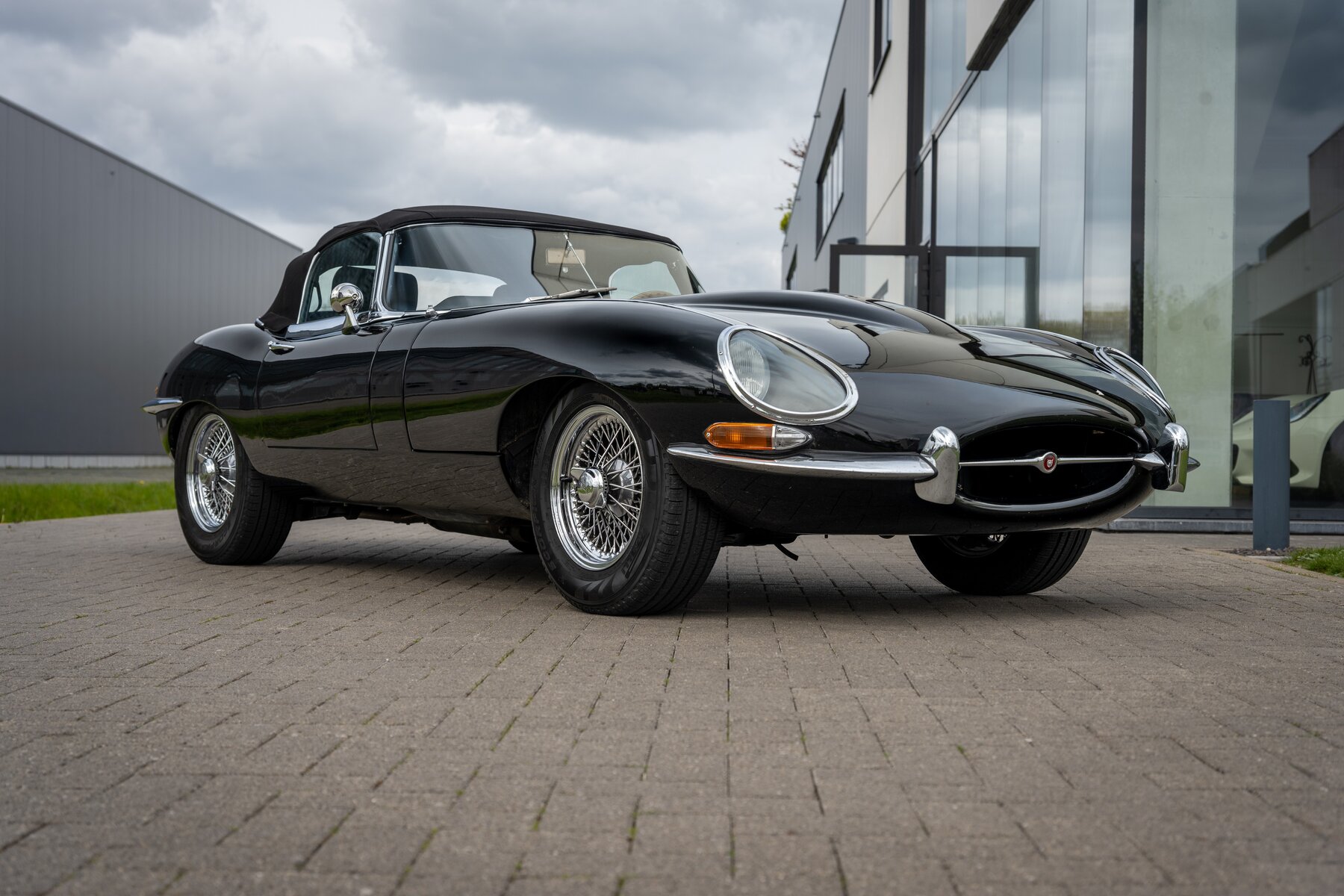 De uitvoering is bijzonder stijlvol en tijdloos: zwart exterieur, een zwart mohair cabriodak, zwart lederen interieur en prachtige chromen spaakwielen. Een uiterst elegante en krachtige kleurencombinatie die perfect past bij de sensuele lijnen van de E-Type. Met open dak komt het lange motorkapprofiel, de lage zitpositie en de klassieke Jaguar-sfeer nog sterker tot hun recht.