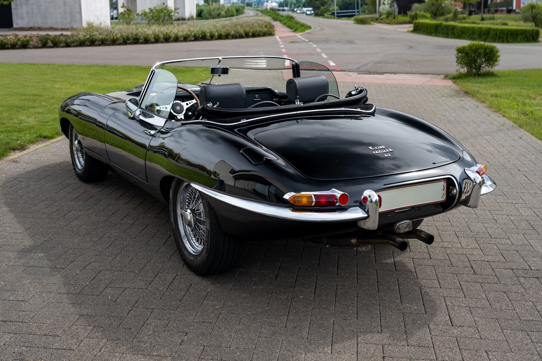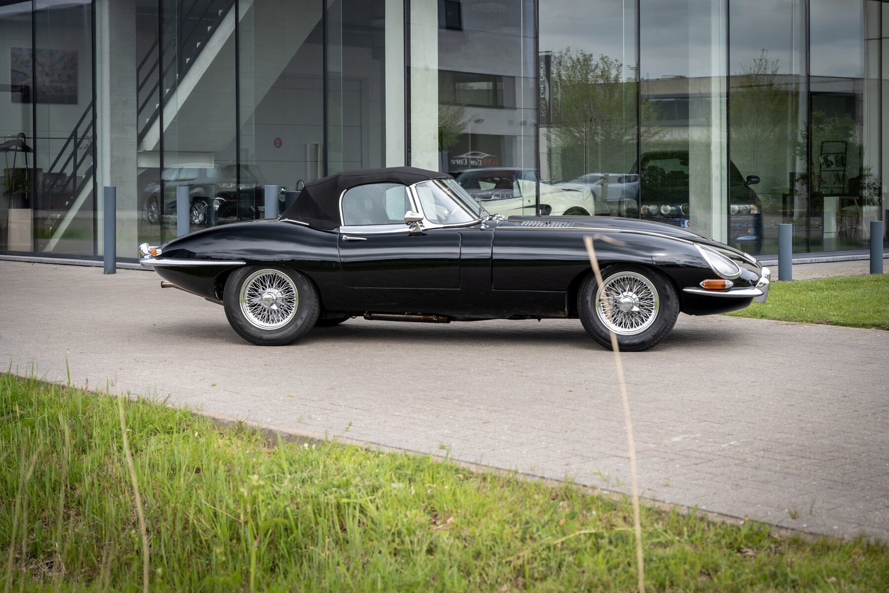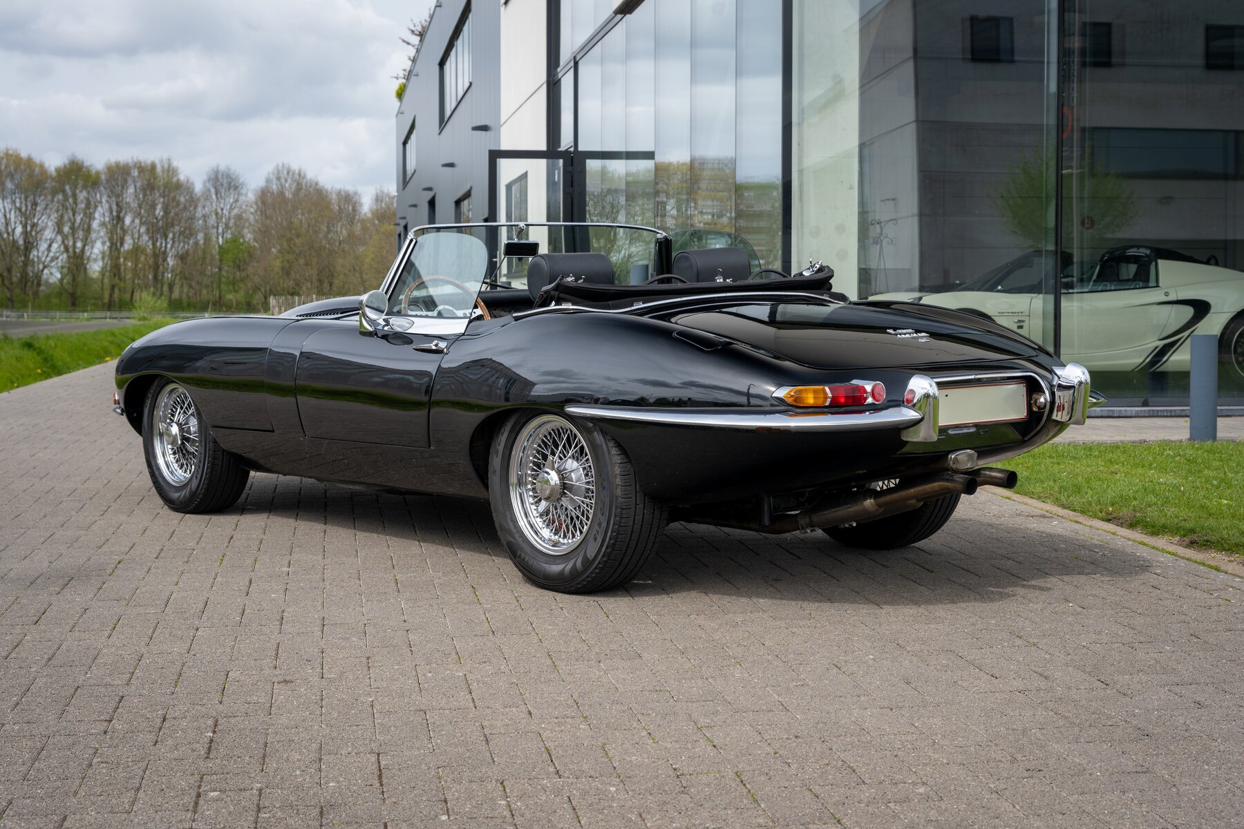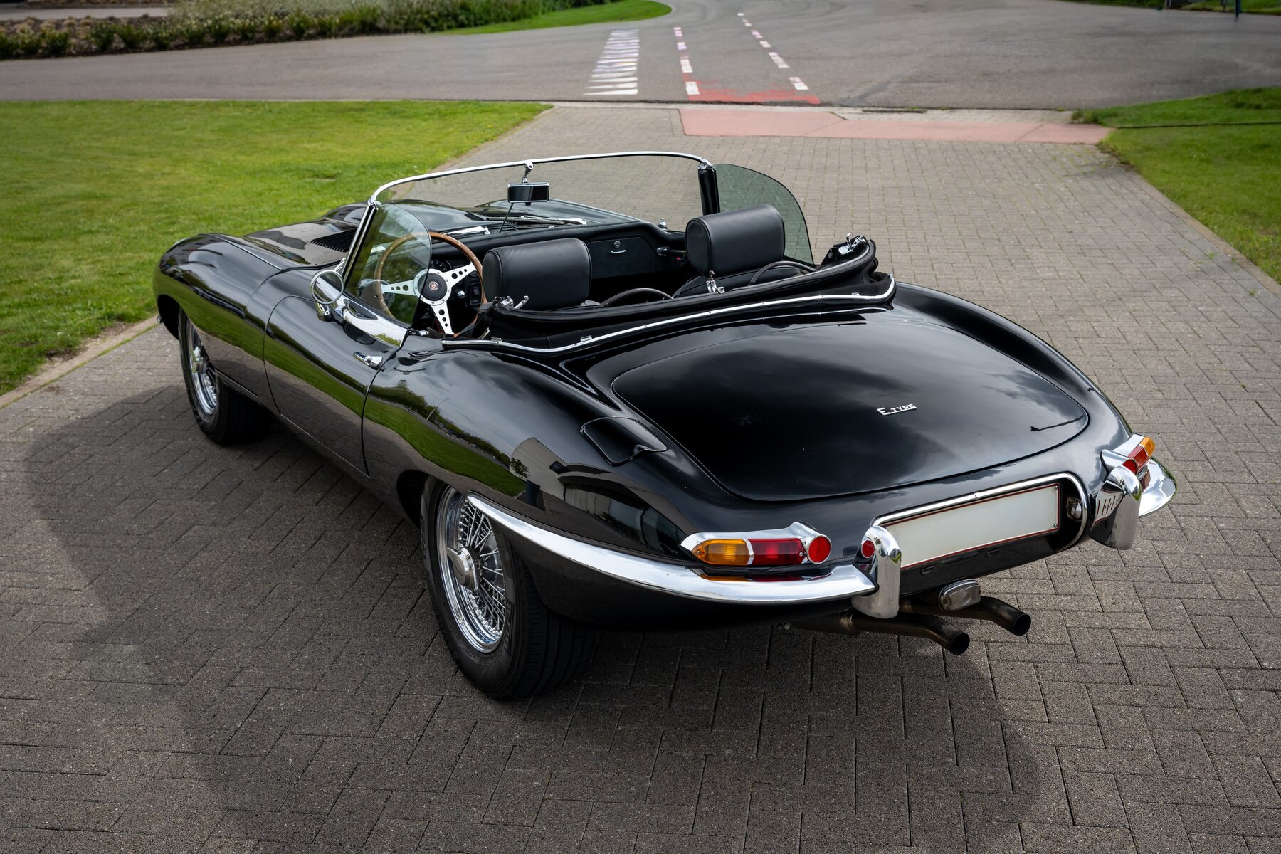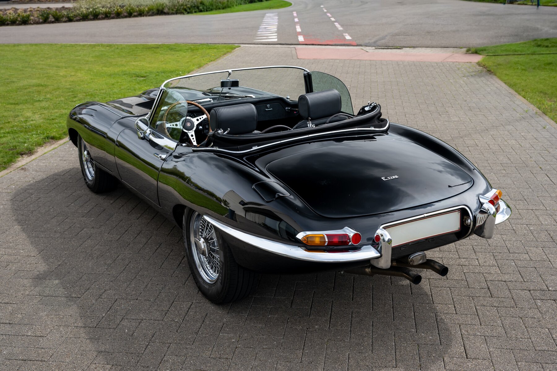 De uitvoering is bijzonder stijlvol en tijdloos: zwart exterieur, een zwart mohair cabriodak, zwart lederen interieur en prachtige chromen spaakwielen. Een uiterst elegante en krachtige kleurencombinatie die perfect past bij de sensuele lijnen van de E-Type. Met open dak komt het lange motorkapprofiel, de lage zitpositie en de klassieke Jaguar-sfeer nog sterker tot hun recht.