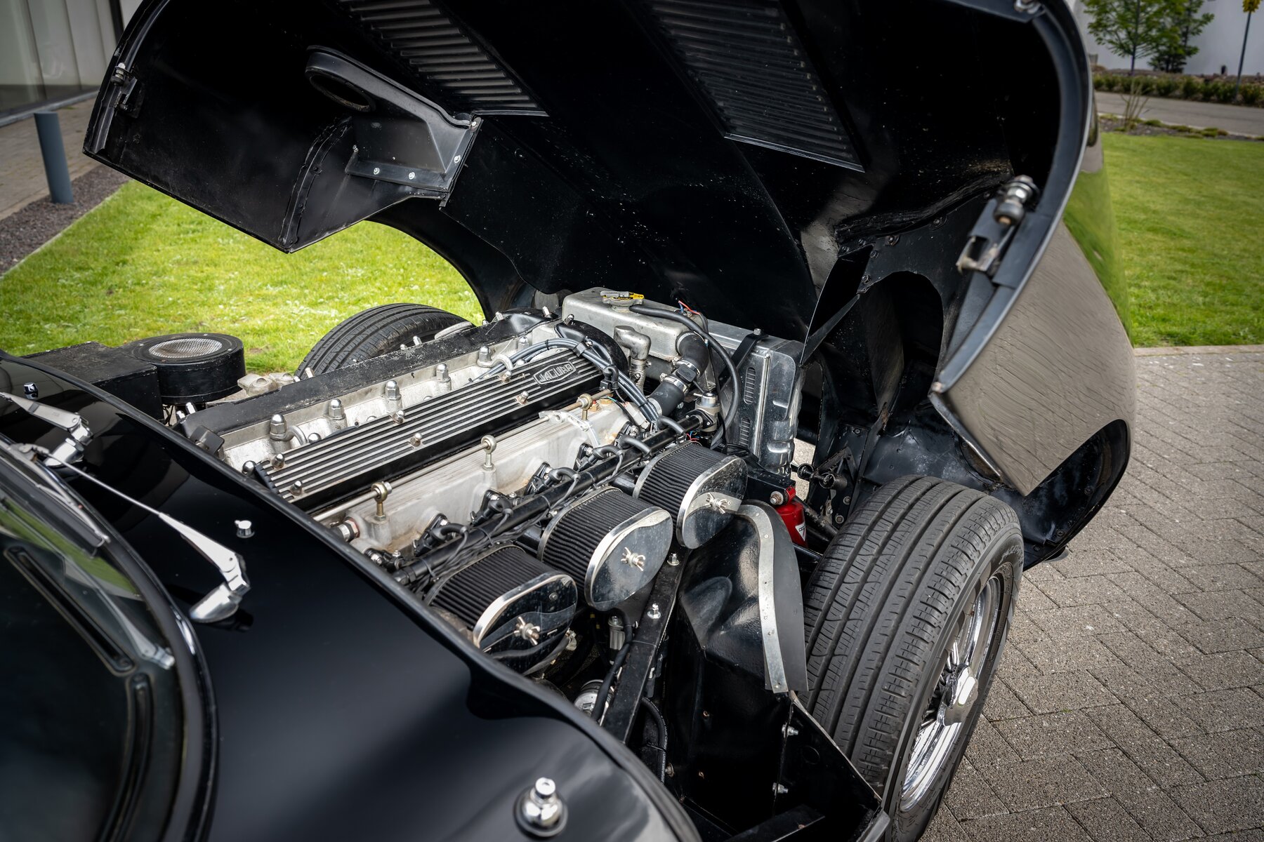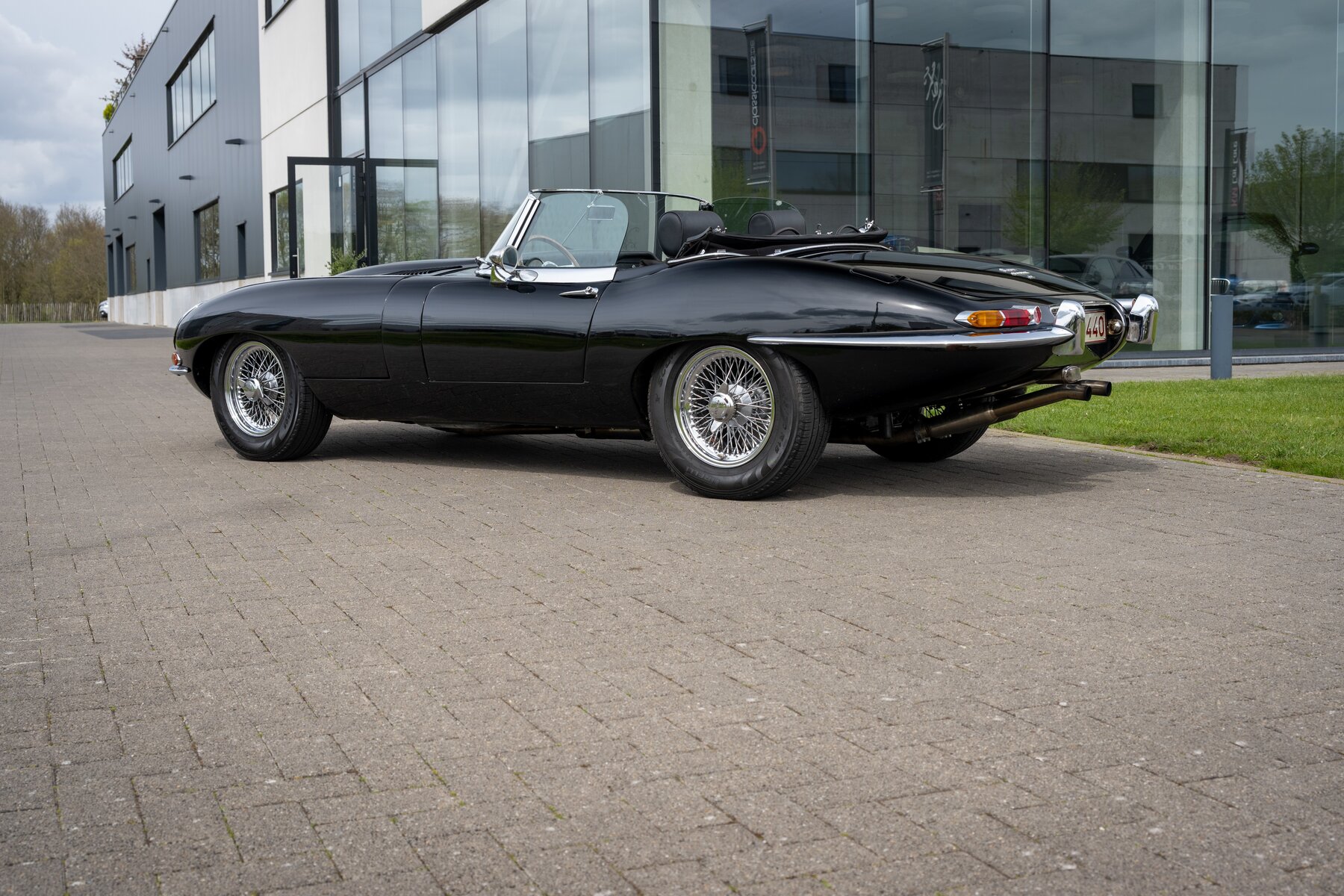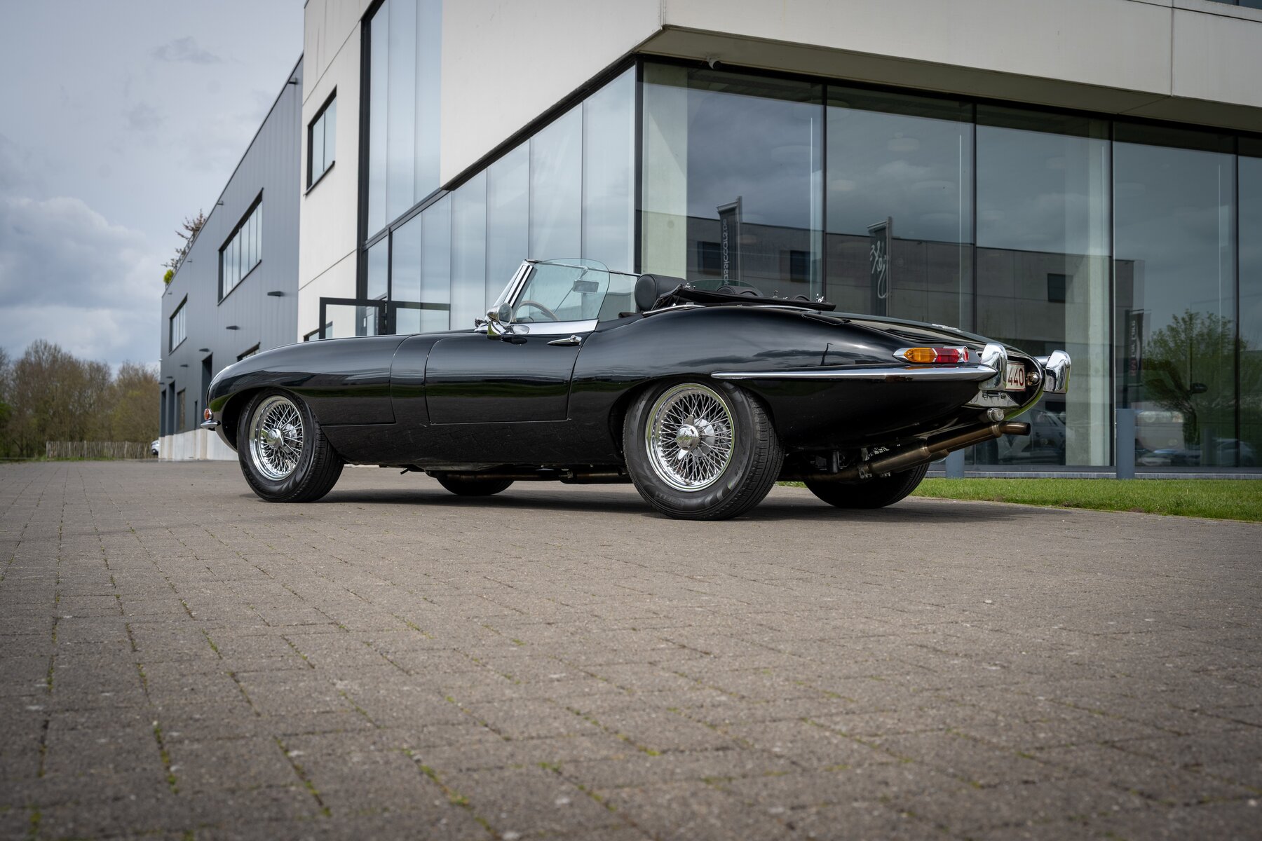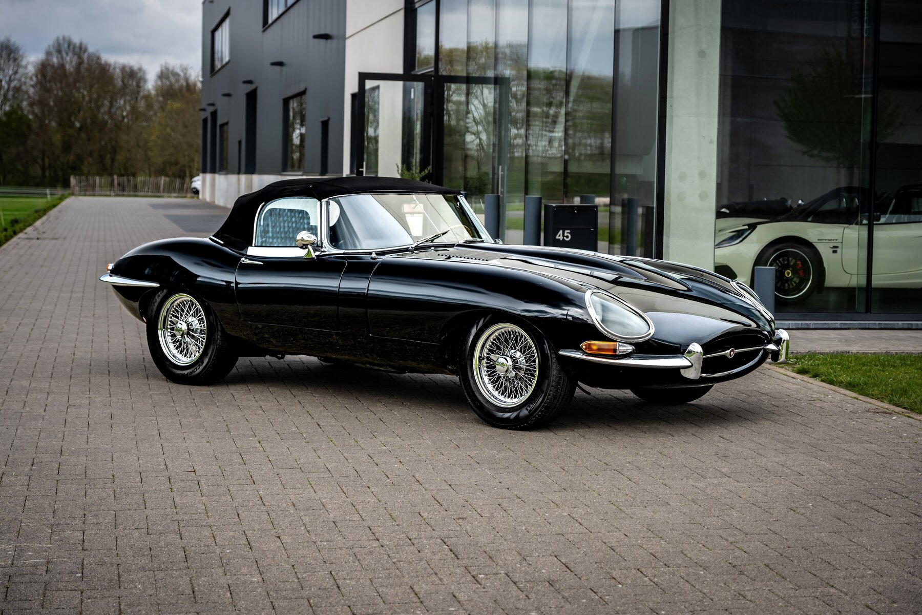 De uitvoering is bijzonder stijlvol en tijdloos: zwart exterieur, een zwart mohair cabriodak, zwart lederen interieur en prachtige chromen spaakwielen. Een uiterst elegante en krachtige kleurencombinatie die perfect past bij de sensuele lijnen van de E-Type. Met open dak komt het lange motorkapprofiel, de lage zitpositie en de klassieke Jaguar-sfeer nog sterker tot hun recht.