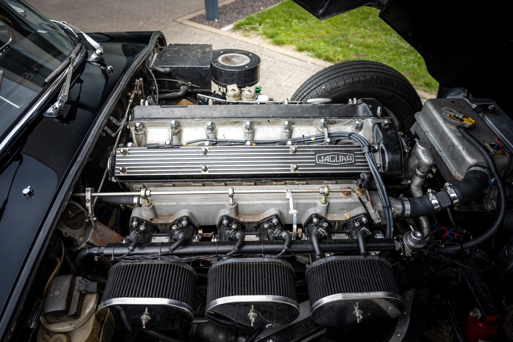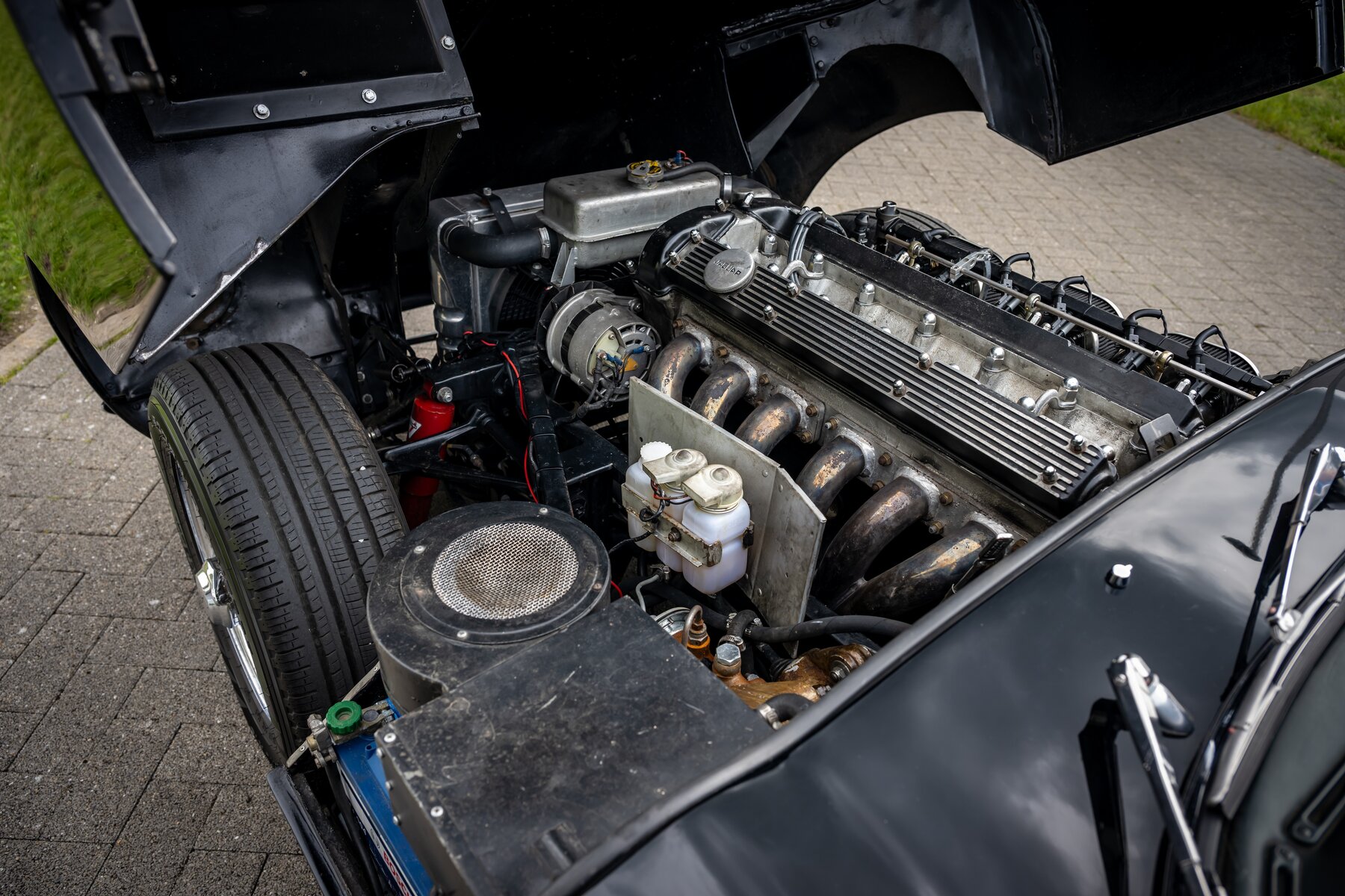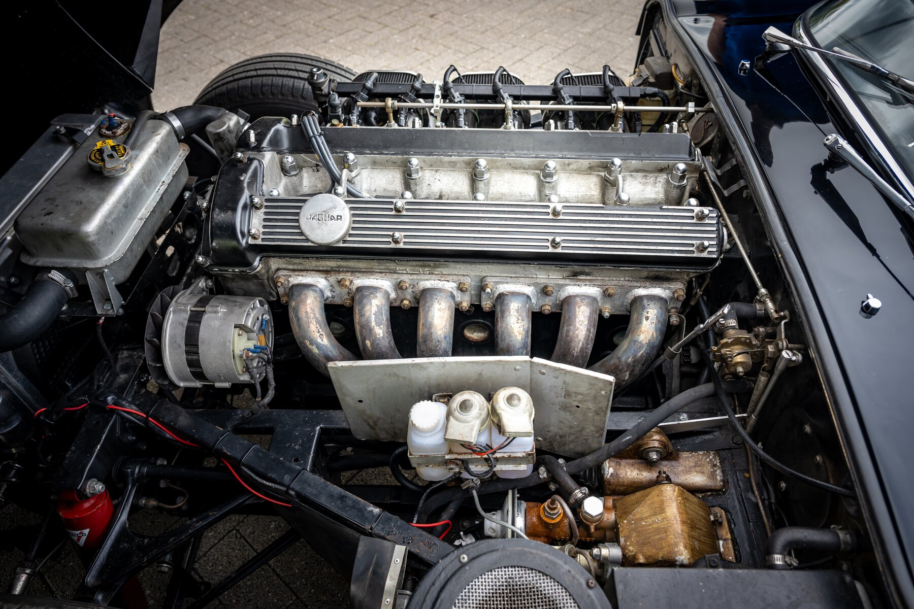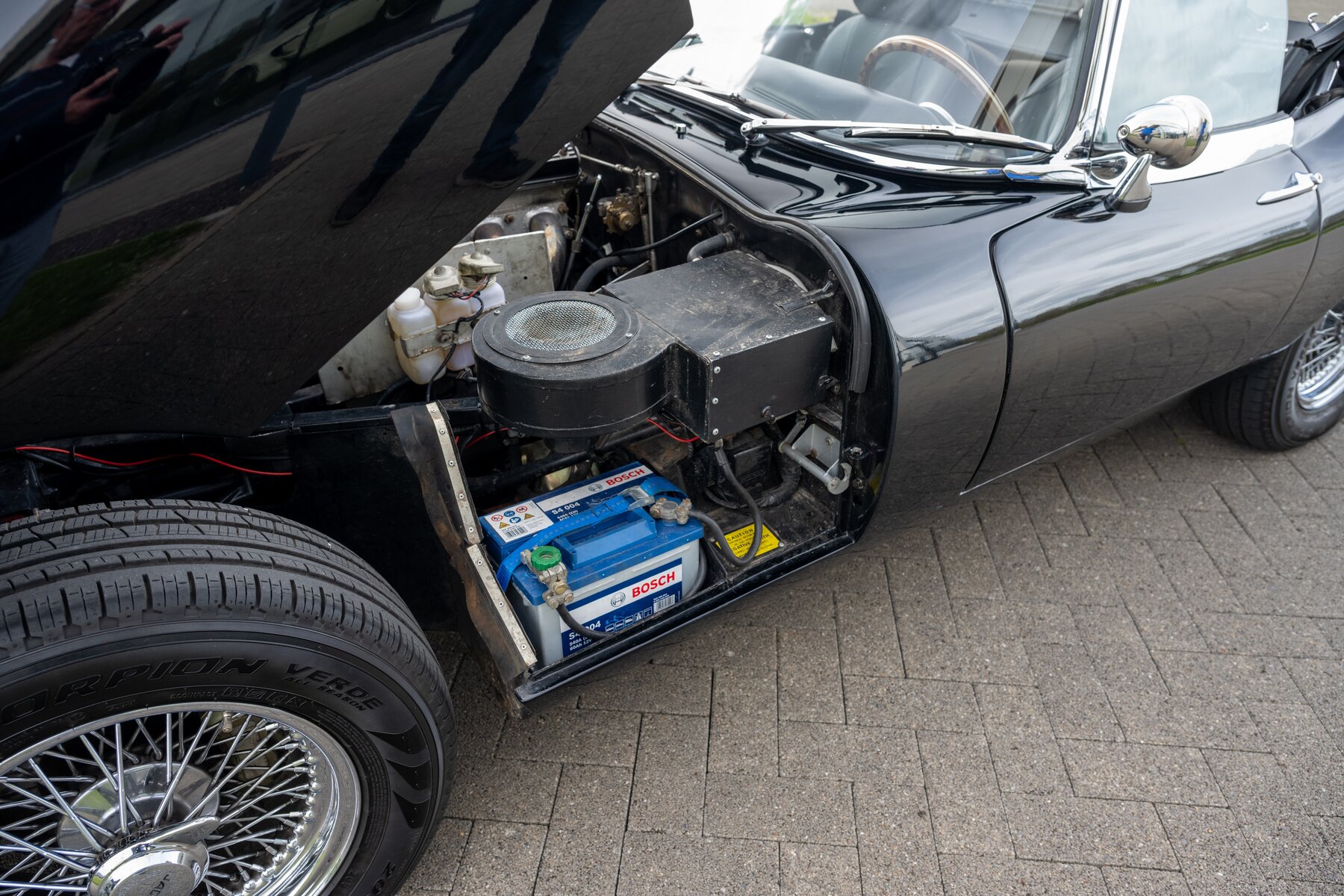 Daarnaast beschikt deze E-Type over een gesynchroniseerde 5-versnellingsbak, wat het rijden aanzienlijk aangenamer maakt, zeker tijdens langere ritten of bij hogere kruissnelheden. Ook de koeling werd verbeterd dankzij een aluminium radiator met elektrische ventilator, een zeer nuttige upgrade voor wie de wagen effectief wil gebruiken en niet enkel bewaren. Voor een betere wegligging zijn Koni-schokdempers gemonteerd, waardoor de auto strakker, stabieler en met meer vertrouwen rijdt.