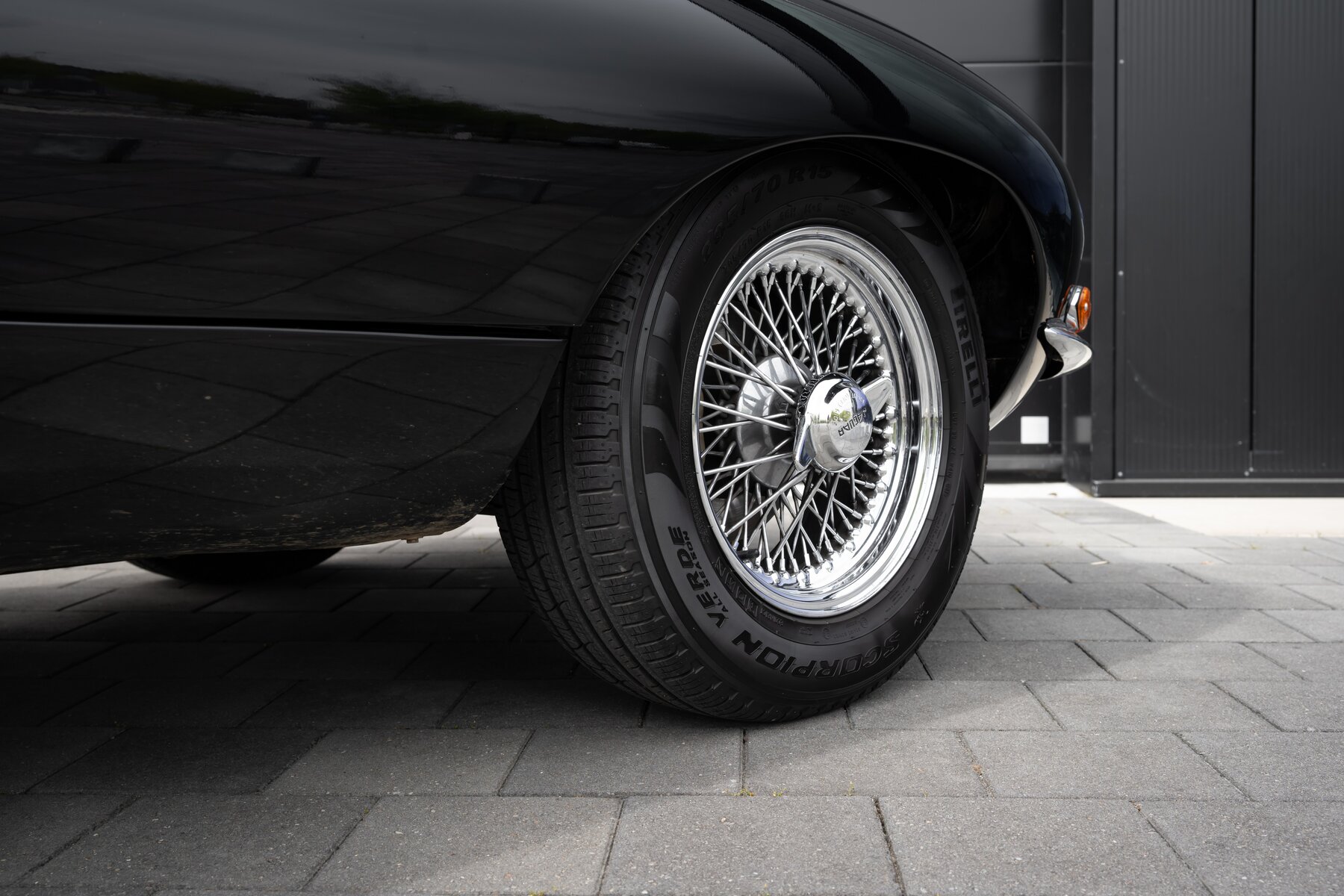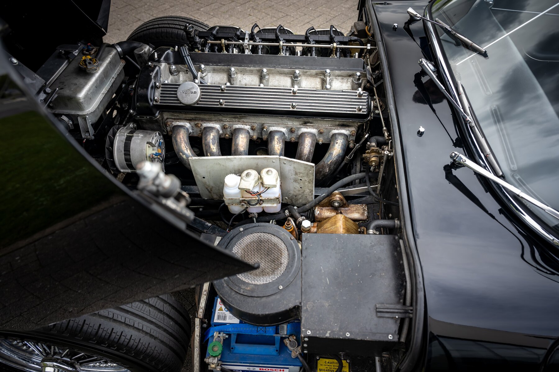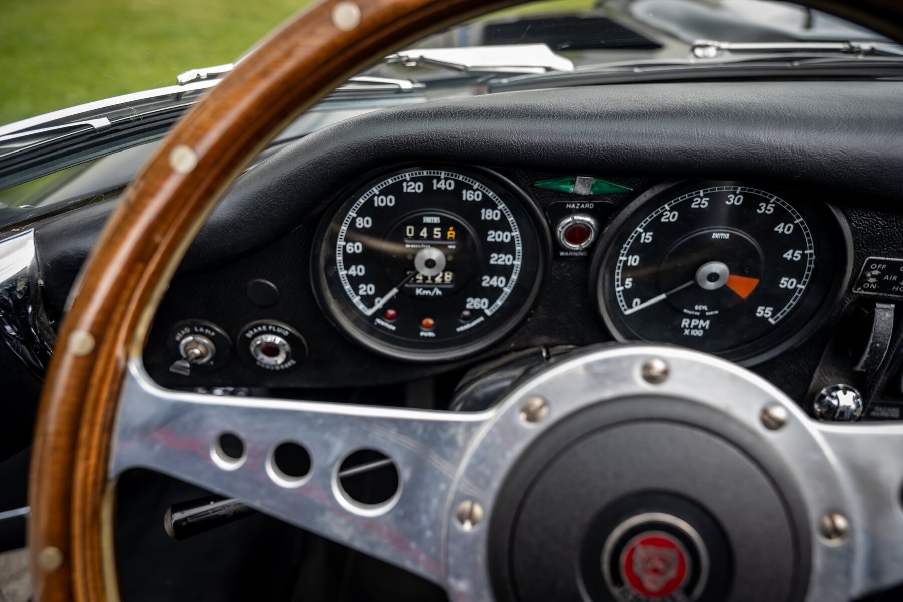 Daarnaast beschikt deze E-Type over een gesynchroniseerde 5-versnellingsbak, wat het rijden aanzienlijk aangenamer maakt, zeker tijdens langere ritten of bij hogere kruissnelheden. Ook de koeling werd verbeterd dankzij een aluminium radiator met elektrische ventilator, een zeer nuttige upgrade voor wie de wagen effectief wil gebruiken en niet enkel bewaren. Voor een betere wegligging zijn Koni-schokdempers gemonteerd, waardoor de auto strakker, stabieler en met meer vertrouwen rijdt.