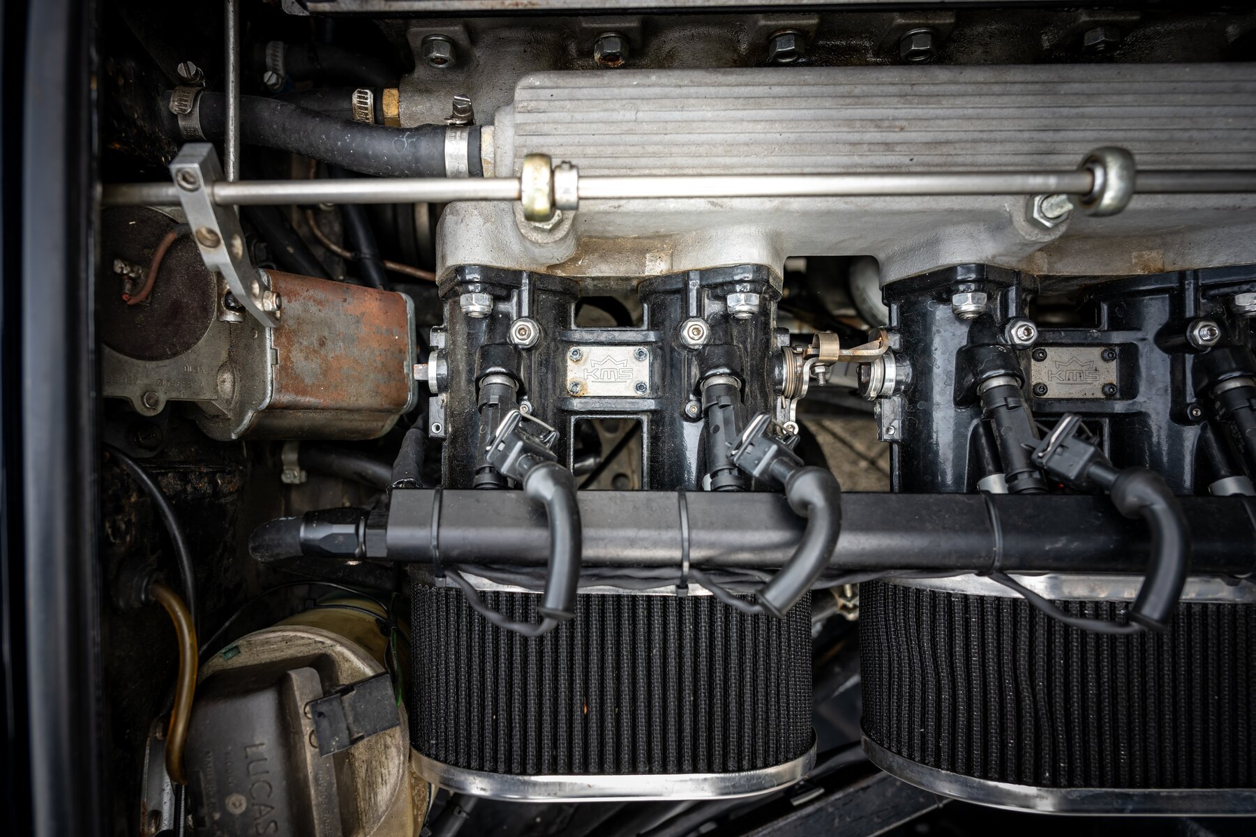 Wat deze wagen extra interessant maakt, is dat hij voorzien is van een reeks doordachte technische upgrades die hem veel gebruiksvriendelijker maken in het moderne verkeer, zonder afbreuk te doen aan zijn klassieke karakter. Zo werd de wagen uitgerust met een KMS-injectiesysteem, gecombineerd met een speciaal uitlaatsysteem met lambdasensoren om het brandstofmengsel optimaal te regelen. Dit zorgt voor een veel fijnere motorloop, betere betrouwbaarheid en een meer precieze afstelling dan bij een klassieke carburateursetup. De factuur van deze ombouw is aanwezig in het dossier van de wagen.