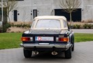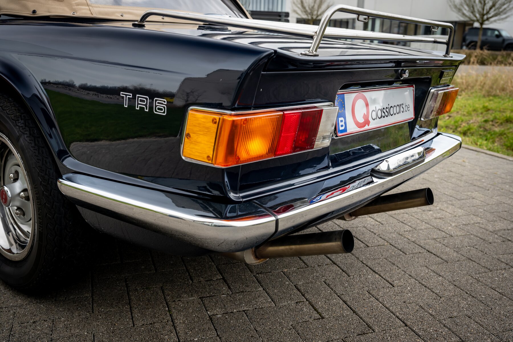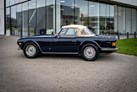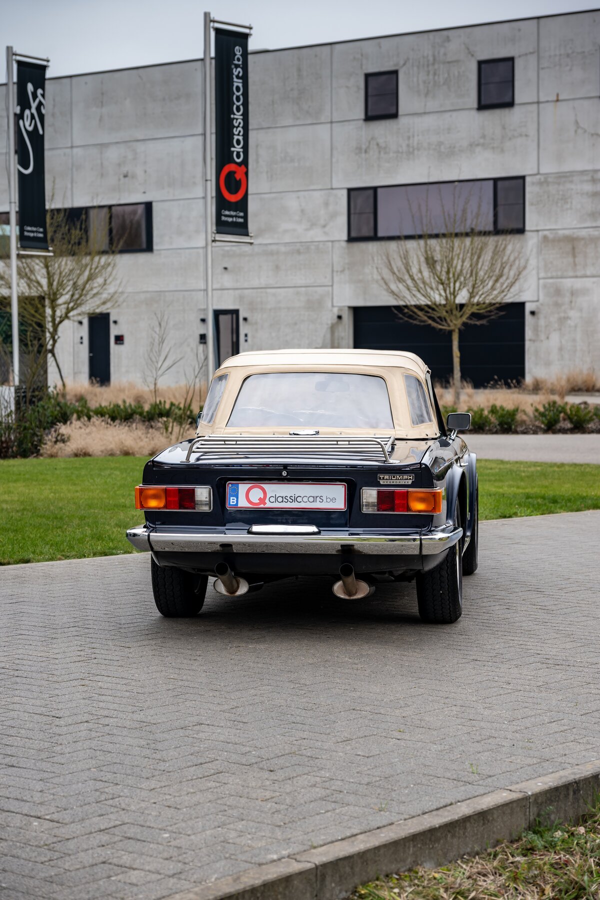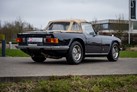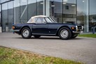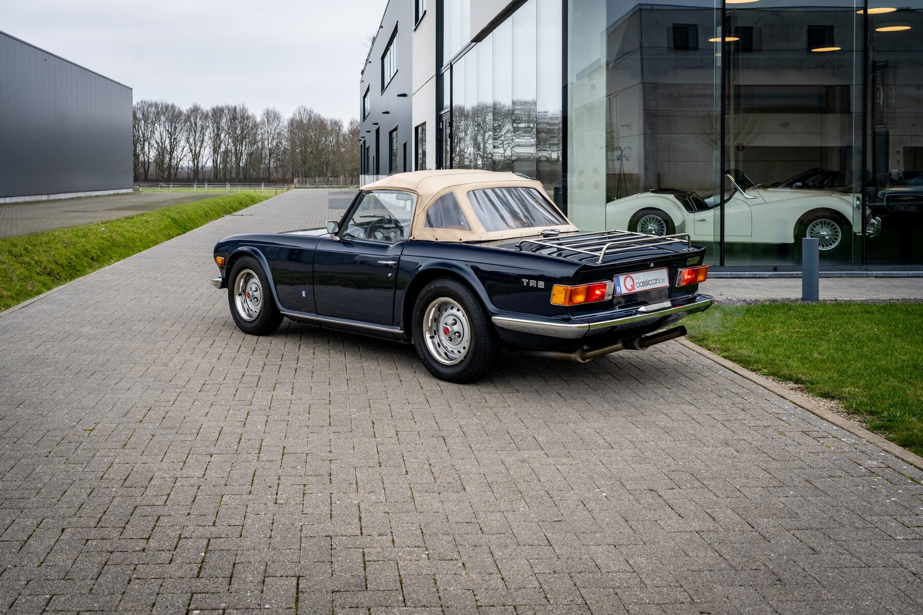 Triumph TR6 (1974) – Donkerblauw | Overdrive | Beige mohair dak